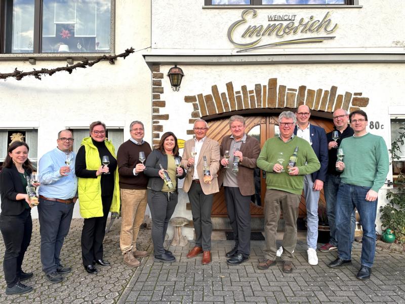 Foto-Unterzeile: Mit der Geschäftsführerin der Romantischer Rhein Tourismus GmbH Kristina Neitzert, Winzer Gotthard Emmerich, Mittelrhein-Wein Marketing Chef Stefan Jedele, den Bürgermeistern Jan Ermtraud und Markus Konitzer sowie Harald Schmillen und Jörg Hohenadl von der Kreis-Wirtschaftsförderung konnte Landrat Achim Hallerbach vor Ort auf den Erfolg des Weinguts Emmerich anstoßen. Foto: Thomas Herschbach